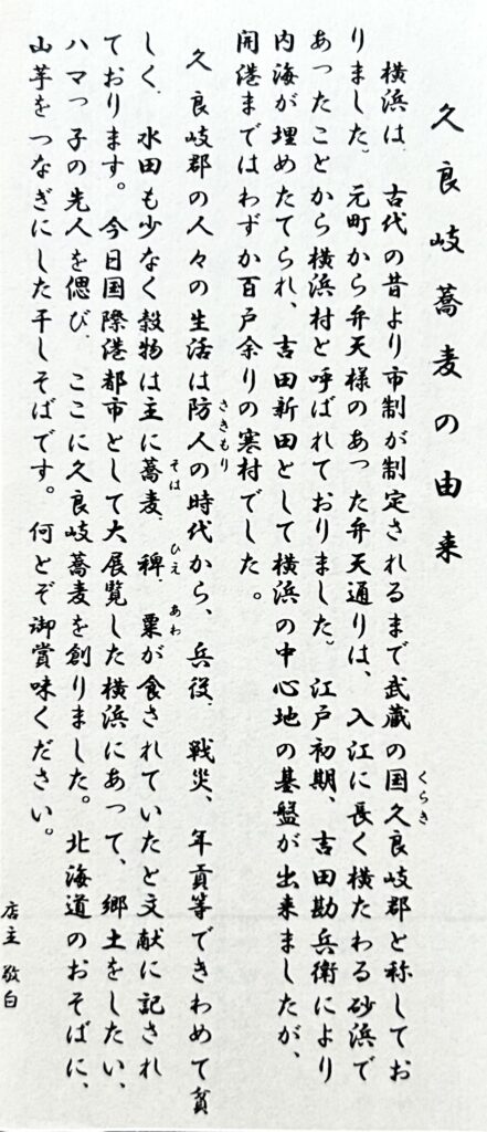 横浜は古代の昔より市制が制定されるまで武蔵の「久良岐(くらき)郡」と称しておりました。(中略)人々の生活はきわめて貧しく、蕎麦、稗(ひえ)、粟(あわ)が食されていたと文献に記されています。今日国際港都市として大展覧した横浜にあって、郷土をしたい、ハマっ子の先人を偲び、ここに久良岐蕎麦を作りました。 店主敬白