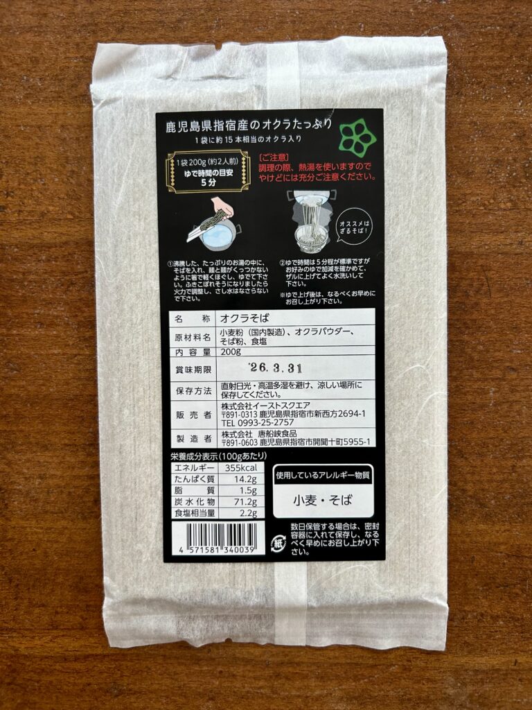【原材料】 小麦粉(屋内製造)、オクラパウダー、そば粉、食塩
