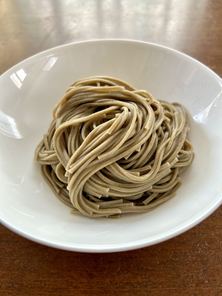 【管理人のコメント】 この干しそば1袋には指宿産のオクラ15本分のパウダーが練り込まれている。茹でているときにほんのりと青物の香りがするが、食べてみるとオクラの風味はあまり感じられない。どちらかというと食感のほうでオクラのトロミが効いているようだ。そばには珍しい軟めでモチっとした食感が楽しめた。
